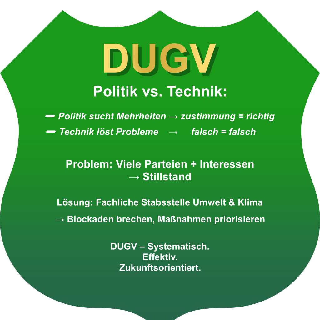 Diese Seite erläutert, warum politische Entscheidungsprozesse häufig nicht die Effizienz und Logik technischer Systeme erreichen. Sie zeigt die grundlegenden Unterschiede zwischen fachlicher, systematischer Problembearbeitung (z. B. EMAS, Gefährdungsbeurteilungen) und politischen Mechanismen auf. Ziel ist es, das Verständnis dafür zu schärfen, warum gute Lösungen politisch oft nur langsam umgesetzt werden – und wodurch sich dennoch wirksame Wege ergeben. Dabei wird auch die Bedeutung einer Stabsfunktion für Umwelt- und Klimaschutz diskutiert.